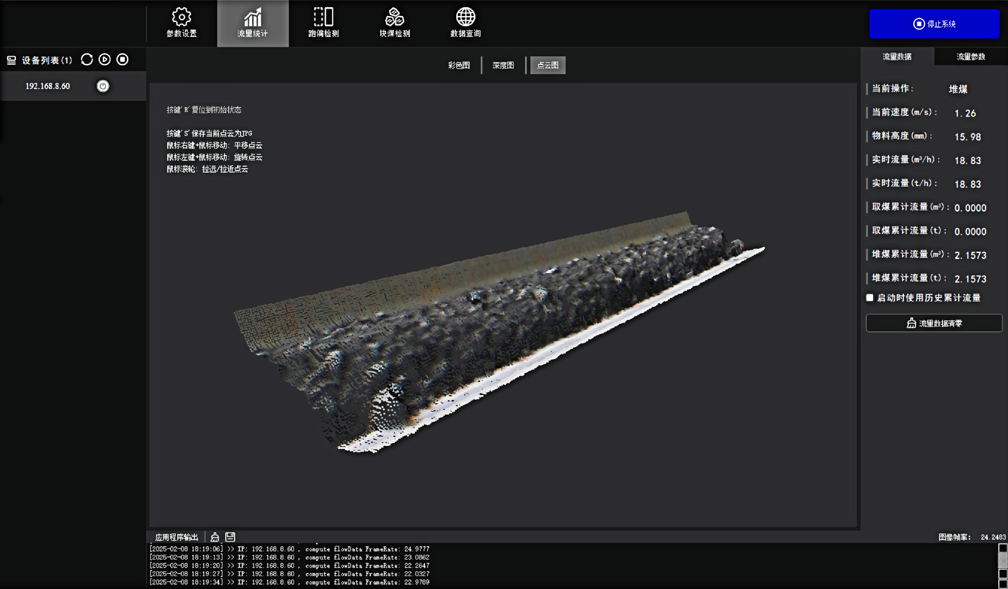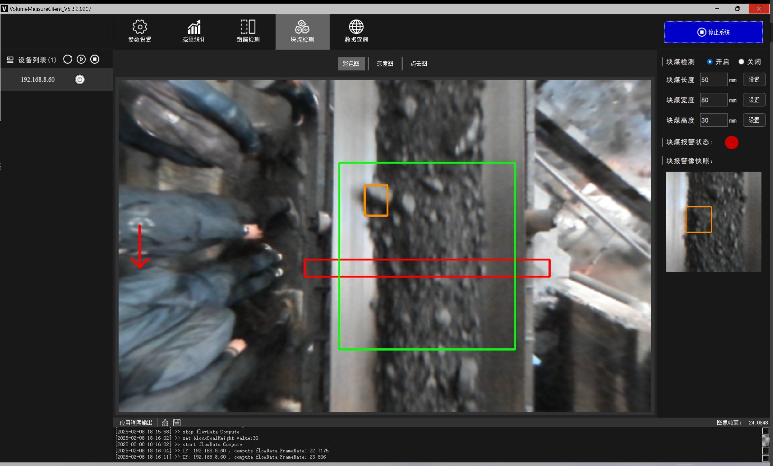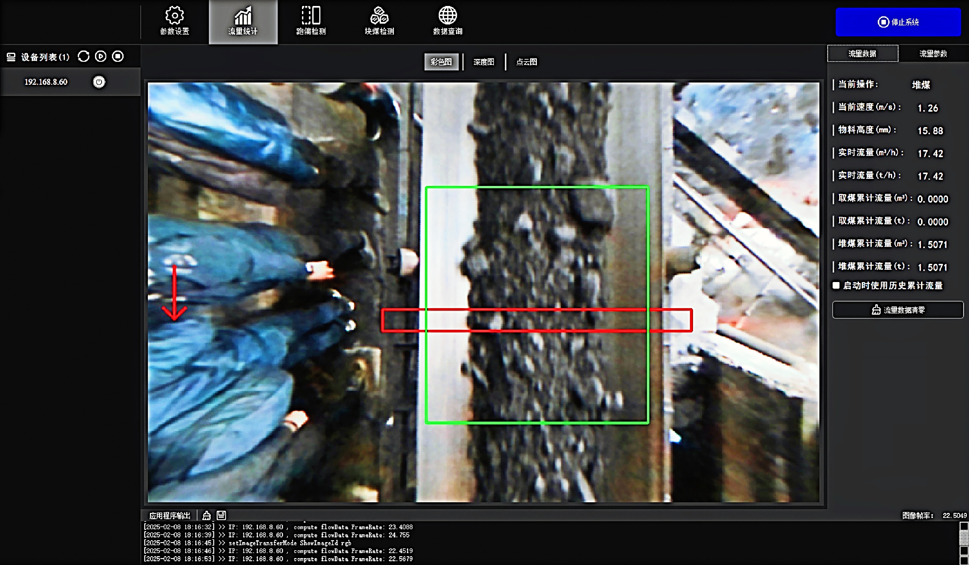料型料流监测一体机系统 凯发®智能料型料流监测系统由智能煤流监测一体机搭配监测平台构成,实时监测输送带工业散料流量,包含煤矿、砂石骨料、粮食等 首页 产品 3D相机 凯发® 料型料流监测一体机 RBGD智能一体机 凯发® 料型料流监测一体机 系统由智能料流监测一体机搭载监测平台构成,由稳定的底层硬件、嵌入式算法软件和自动化监测管理平台实现服务,实时采集高精度煤流RGBD数据,完成场景的实时三维彩色点云重建,对高速运动的皮带输送机进行精细化管理调控→应用场景: 煤矿检测系统精细化管理 定制解决方案 应用场景 煤流统计支持皮带速度6m/s,环境适应强,部署简单,无需改造现场环境即可安装块煤检测通过三维点云数据分析,能够对块煤的尺寸进行精确测量,准确计算出块煤的长、宽、高等尺寸数据输送带自动测速自动测量高速运动中的输送带速度,确保及时发现异常波动输送带跑偏检测通过获取的输送带三维尺寸位移信息,对皮带左右边缘位置与阈值比较并判断是否偏离正常轨道,同时计算跑偏幅度和方向煤流高度检测对煤流高度精准检测,能够有效管理煤流的分布、运输量、堆积情况 产品特点 测量误差<5%在高速动态检测上,测量精度可达毫米级,测量结果与实际煤量误差小于5%工业级硬件设计采用IP65防护等级和工业级防尘防水,可在高粉尘、大温差的情况下稳定运行室内暗光环境适用在室内、地下、夜晚能稳定测量,无需补光部署简单,安装便捷,支持二次开发出厂相机内参标定,可快速部署集成,无需改变现场环境即可安装,实施速度快,调试简单,系统易于维护接口丰富,数据直传丰富的系统对接接口,可直接对接PLC、变频器、服务器,快速完成精细化皮带控制大景深、大视野,多范围应用测量皮带宽度达2.4m;煤堆高度达1.5m边缘计算架构,实时测量使用边缘计算架构,将多种智能算法在边缘端实现,保证数据实时传输 性能参数 RGBD智能一体机型号VEA020-800-X180参数技术原理主动式双目基线长度180mm测量范围0.9m~2.5mZ向精度1m:≤1.3mm帧率25fps数据类型深度图、彩色图、红外图、点云图分辨率彩色图像:1280x800/640x400 ; 深度图像:1280x800/640x400像素形式彩色图: 8位三通道图 ;深度图:16位单通道图彩色视场角Horizontal 90°,Vertical 64°深色视场角Horizontal 90°,Vertical 64°RGBD同步对齐支持曝光类型全局曝光曝光控制自动/手动流量统计技术参数推荐安装高度1.2m~1.5m覆盖输送带范围0~3m支持输送带速度0~6m/s,推荐0~4m/s流量统计精度误差<5%物料高度测量支持,精度毫米级自动测速支持,安装位置需要具备照明条件实时流量统计 支持,统计周期支持配置跑偏检测支持,跑偏精度可达毫米级块煤检测 支持,支持块煤参数定义数据存储支持5年以上体积结果化数据存储数据查询支持按小时,天和月等维度查询实时视频支持rtsp协议彩色图像拉流点云数据支持彩色点云拼接数据输出协议支持TCP硬件参数数据传输接口千兆以太网相机供电要求12V~24V DC功耗18w结构尺寸(mm)270mm x 80mm x 44mm重量(g)1200g防护等级IP65温度工作温度:-25 ~50°C ;存储温度:-30 ~80°C湿度20% ~ 85%散热方式被动散热软件支持开发环境Windows/Linux数据协议TCP数据查看流量统计客户端 点云图 资料下载 凯发® 煤流体积测量输送带监测管理平台 产品资料下载 请填写此表格并点击提交后,程序会自动下载文件 *合作意向 请选择 商务合作 媒体合作 投资者合作 *电话 *姓名 公司 行业 职位 邮箱 地址 您的留言 提交并下载资料 您也可以拨打凯发的客服电话:010-81046658 联系凯发
